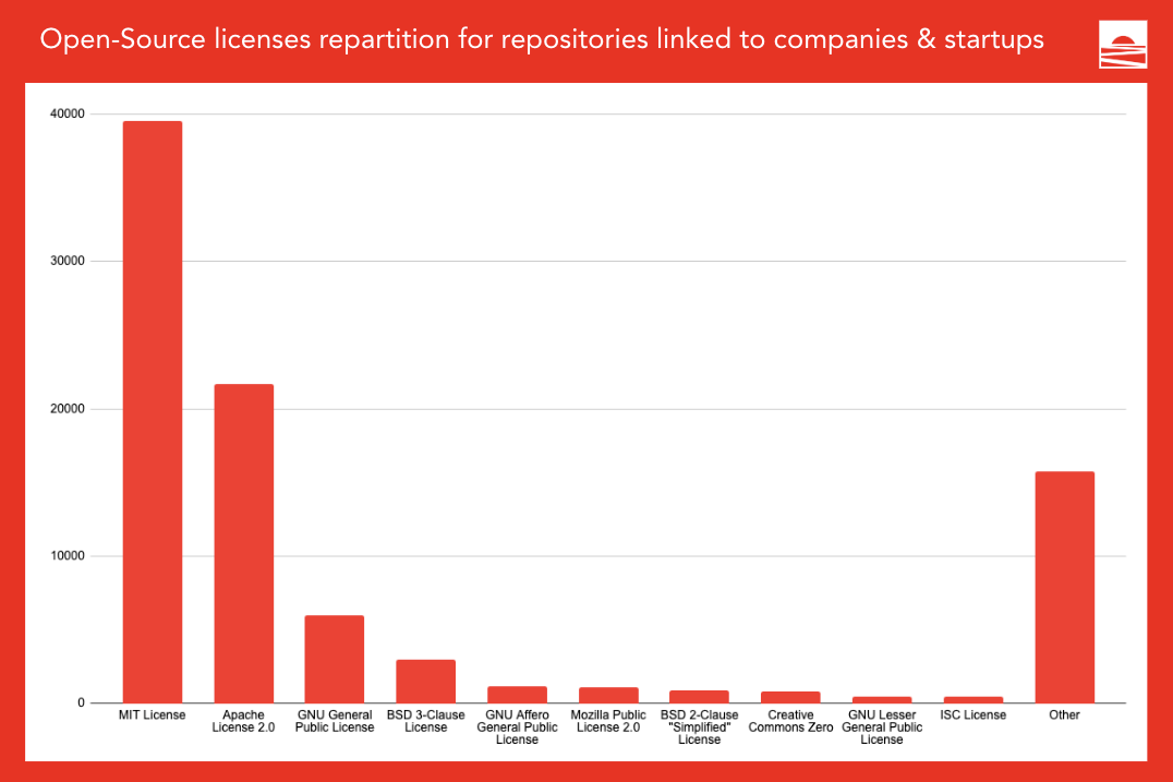 In each of these categories, you can find multiple licenses. The most popular licenses by far are MIT and Apache 2.0 which are both permissive. In the graph below, you can see the repartition of licenses for Github repositories that are linked to companies (using Crunchbase as a company database).