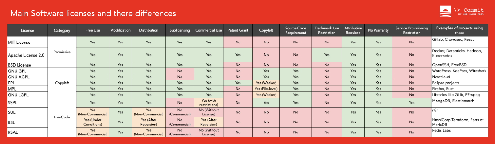 The type of license you choose should align with your business model and strategic objectives. In the table below, you can see the differences between the most well-known licenses and some examples of companies using them.